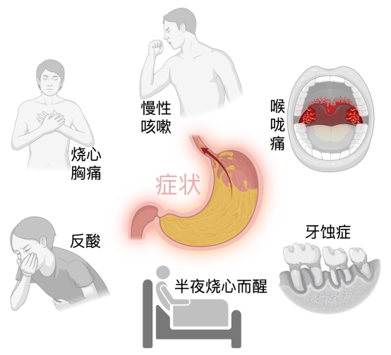 食管外症状:慢性咳嗽、哮喘(胃酸反流到气道,刺激气道引发)、喉咙痛、声音嘶哑、咽部有异物感(总觉得喉咙里有东西,咳不出来也咽不下去),甚至牙齿被酸腐蚀(长期反酸导致牙釉质受损,出现蛀牙、牙齿敏感)。