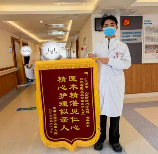 “医术精湛见仁心 精心护理似亲人”出院当天,患者家属特意送来一面锦旗向主管医生卯许有及全科医护人员致谢。