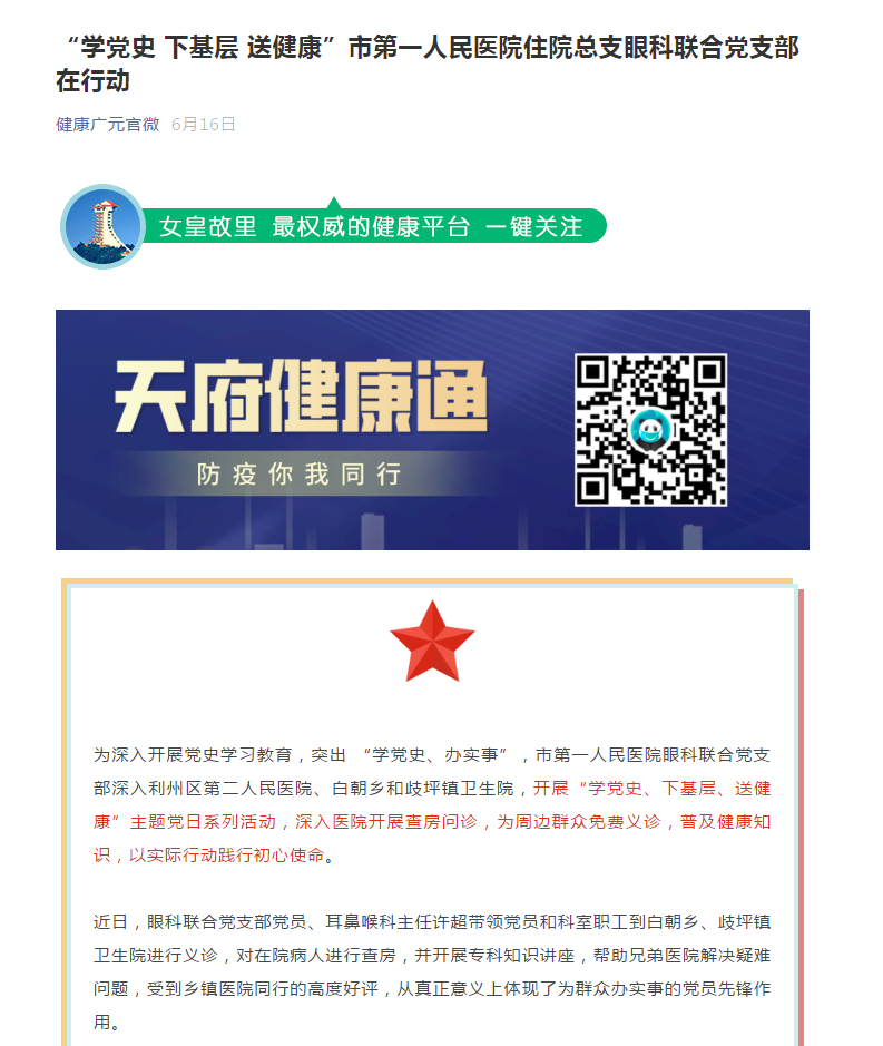健康广元官微:“学党史 下基层 送健康”市第一人民医院住院总支眼科联合党支部在行动