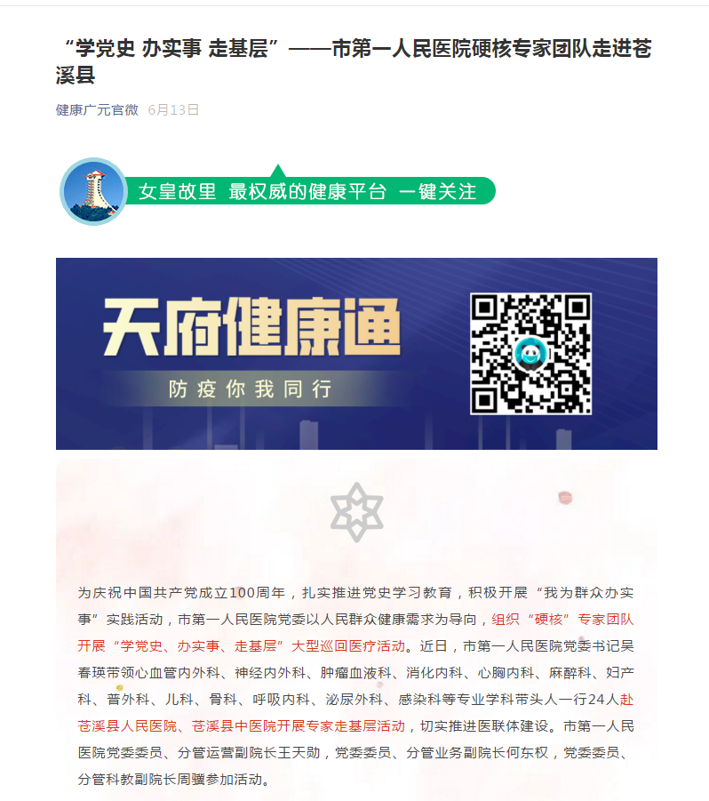 健康广元官微:“学党史 办实事 走基层”——市第一人民医院硬核专家团队走进苍溪县