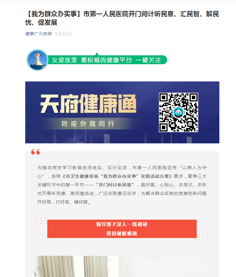 健康广元官微:【我为群众办实事】市第一人民医院开门问计听民意、汇民智、解民忧、促发展