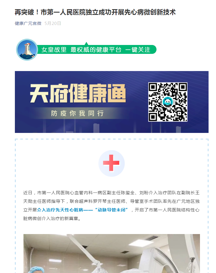 健康广元官微:再突破!市第一人民医院独立成功开展先心病微创新技术