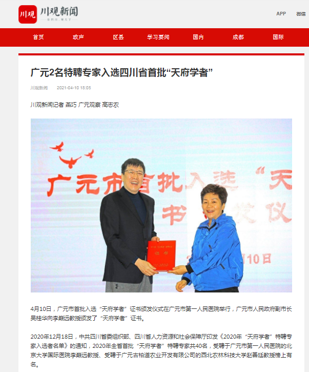 川观新闻:广元2名特聘专家入选四川省首批“天府学者”