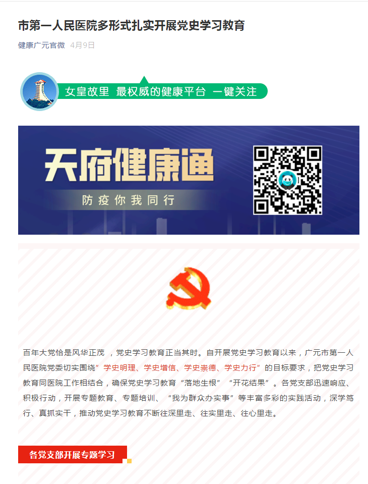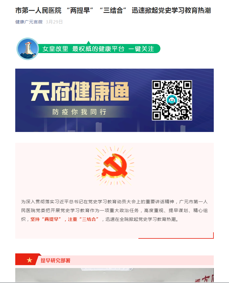 健康广元官微:市第一人民医院 “两提早”“三结合” 迅速掀起党史学习教育热潮