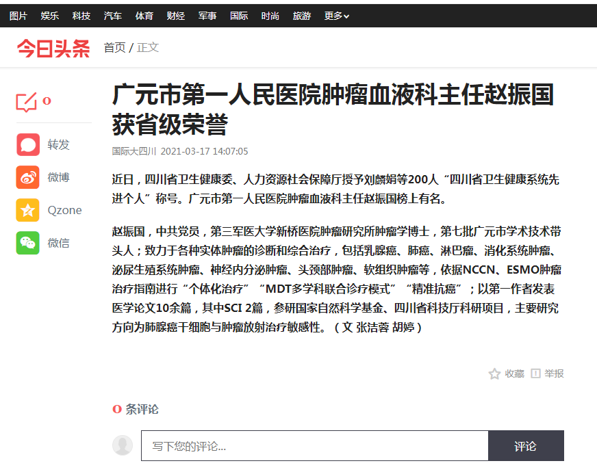 国际在线:广元市第一人民医院肿瘤血液科主任赵振国获省级荣誉