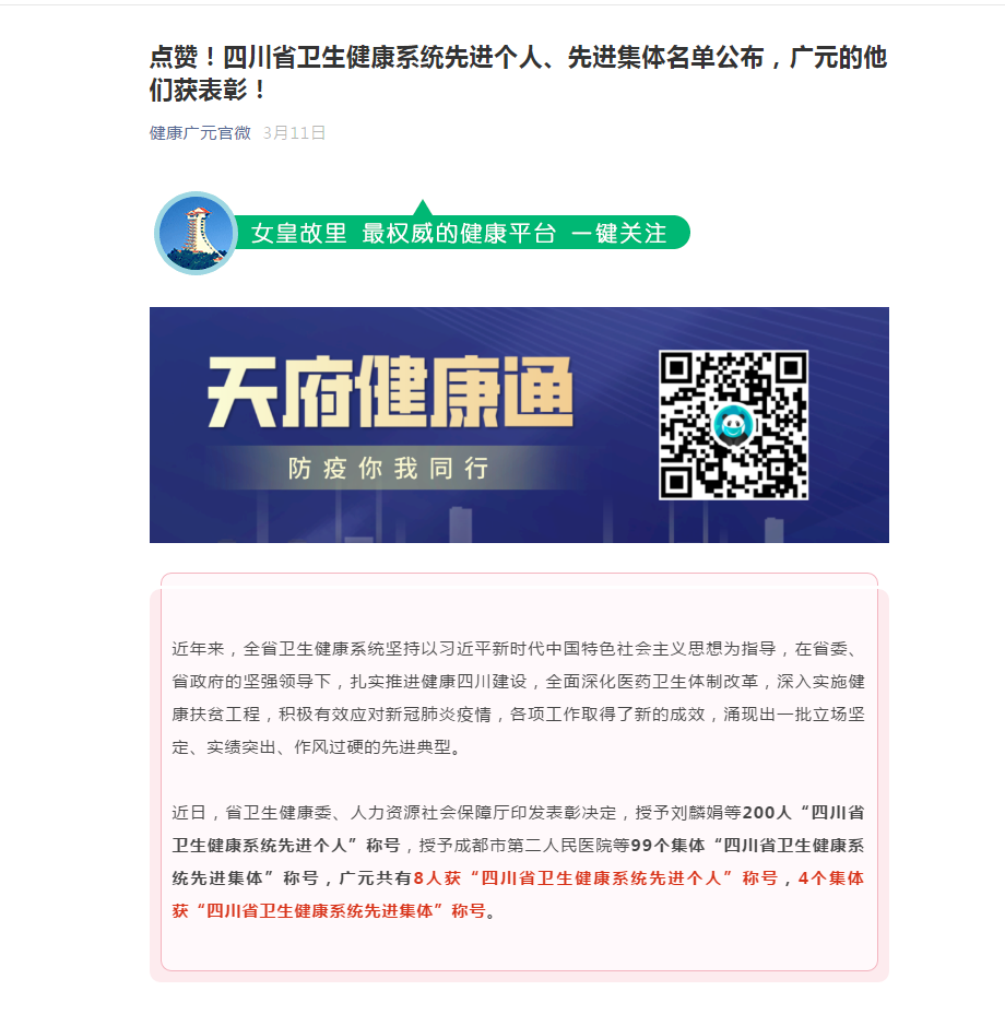 健康广元官微:点赞!四川省卫生健康系统先进个人、先进集体名单公布,广元的他们获表彰!