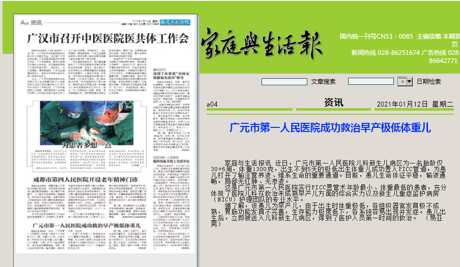 家庭与生活报:广元市第一人民医院成功救治早产极低体重儿