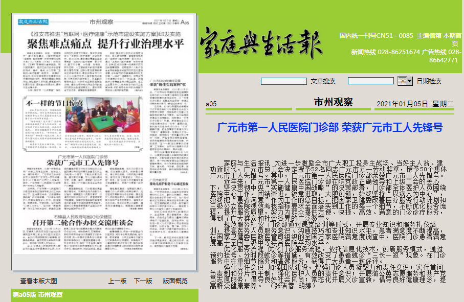 家庭与生活报:广元市第一人民医院门诊部 荣获广元市工人先锋号