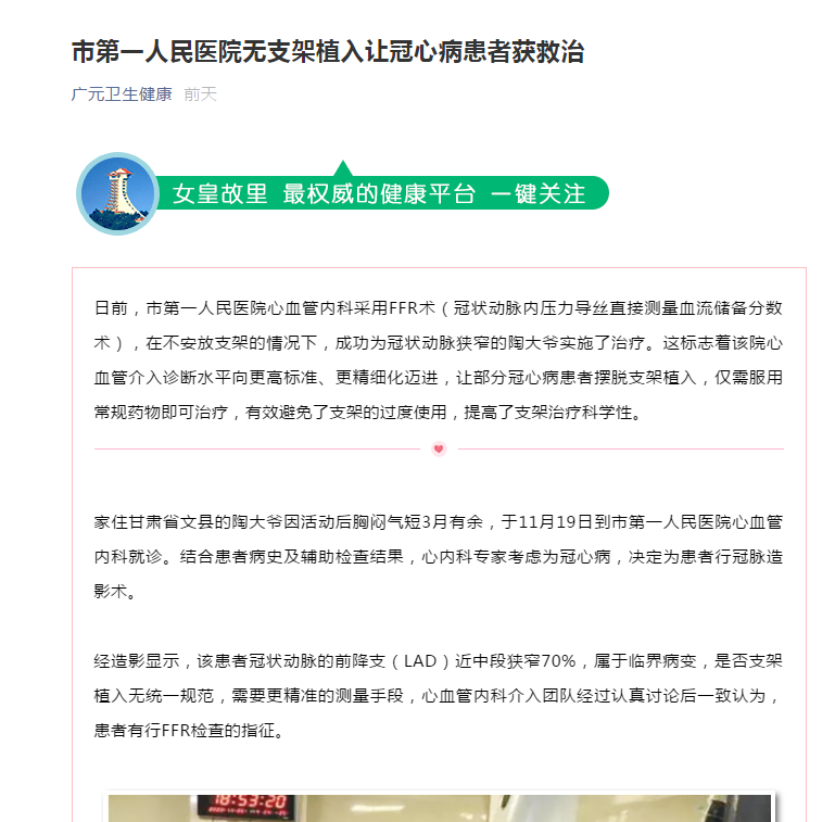 广元卫生健康:市第一人民医院无支架植入让冠心病患者获救治