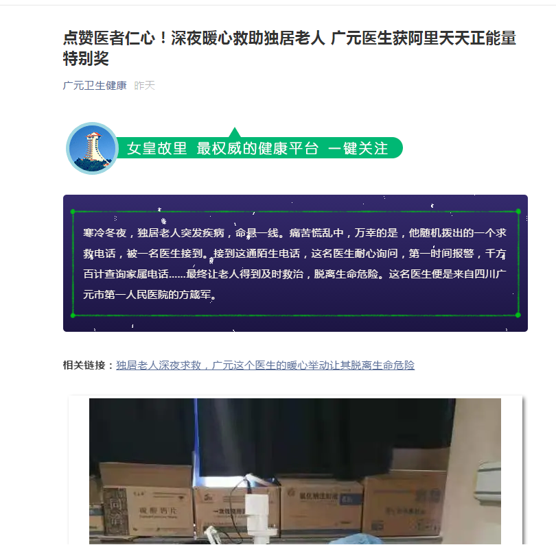 广元卫生健康:点赞医者仁心!深夜暖心救助独居老人 广元医生获阿里天天正能量特别奖