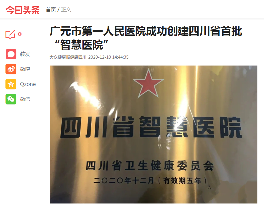今日头条:广元市第一人民医院成功创建四川省首批“智慧医院”