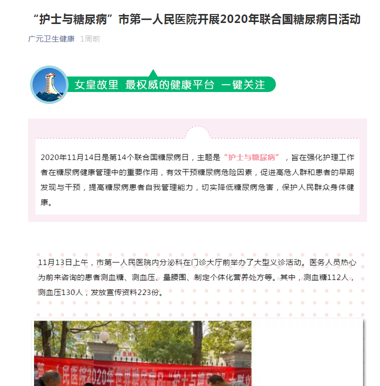 广元卫生健康:“护士与糖尿病”市第一人民医院开展2020年联合国糖尿病日活动