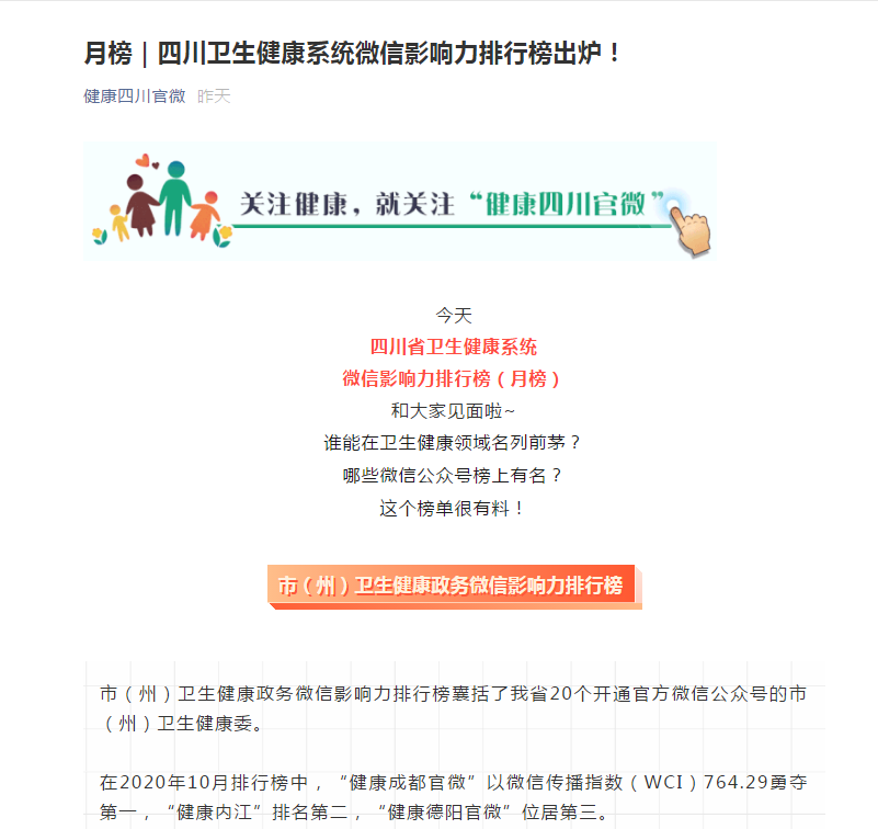 月榜|四川卫生健康系统微信影响力排行榜出炉!