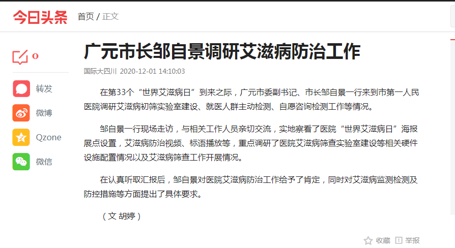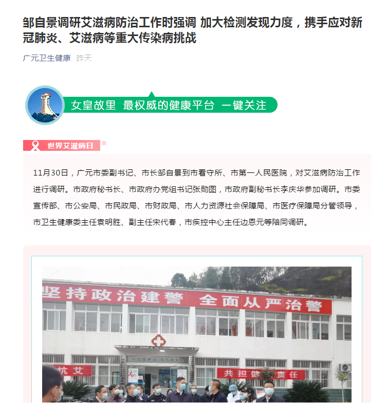 国际在线:广元市长邹自景调研艾滋病防治工作