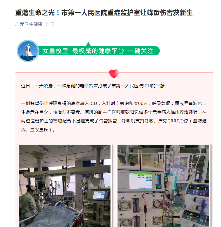 广元卫生健康:重燃生命之光!市第一人民医院重症监护室让蜂蜇伤者获新生