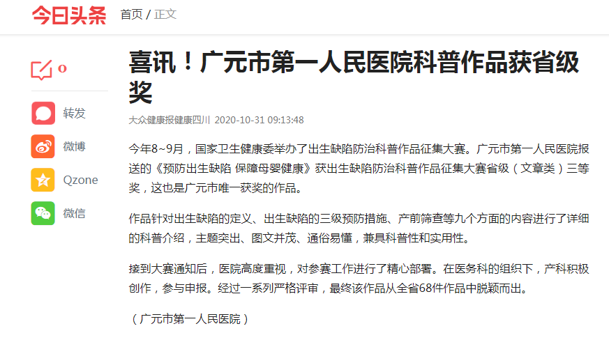 今日头条:喜讯!广元市第一人民医院科普作品获省级奖