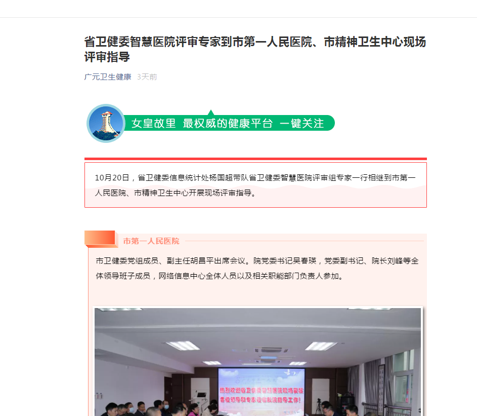 广元卫生健康:省卫健委智慧医院评审专家到市第一人民医院、市精神卫生中心现场评审指导