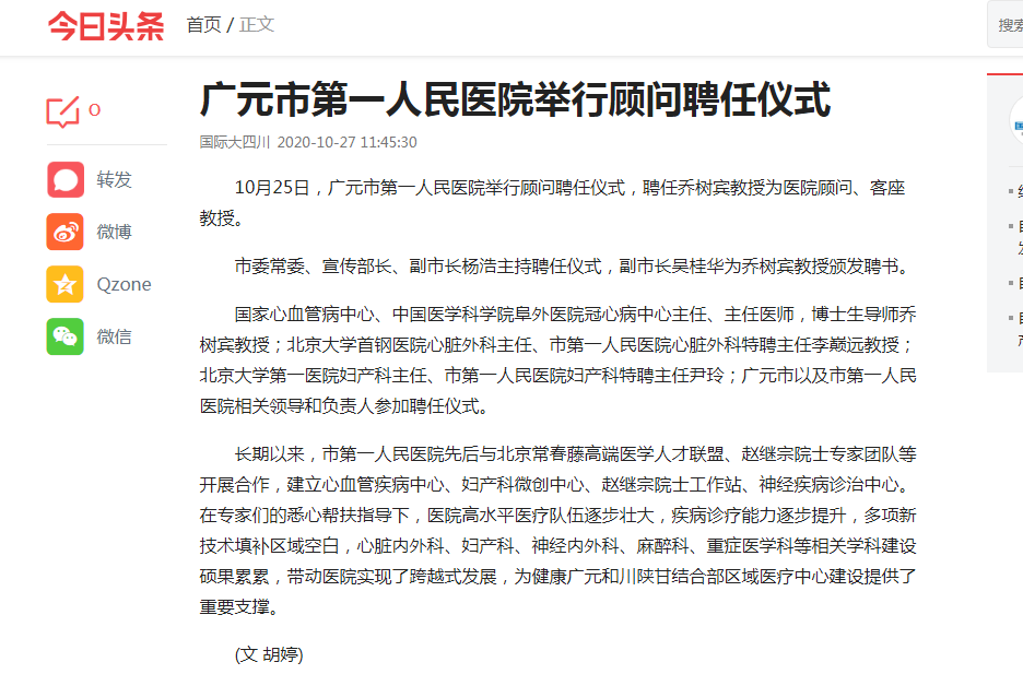 四川在线:广元市第一人民医院隆重举行乔树宾教授顾问聘任仪式