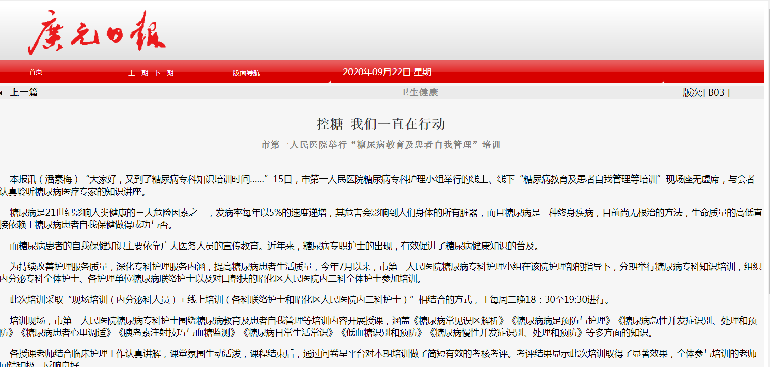 广元日报:控糖 我们一直在行动 市第一人民医院举行“糖尿病教育及患者自我管理”培训