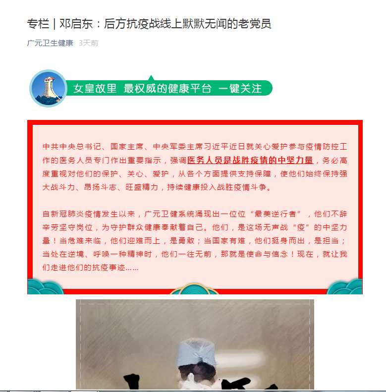广元卫生健康:专栏 | 邓启东:后方抗疫战线上默默无闻的老党员