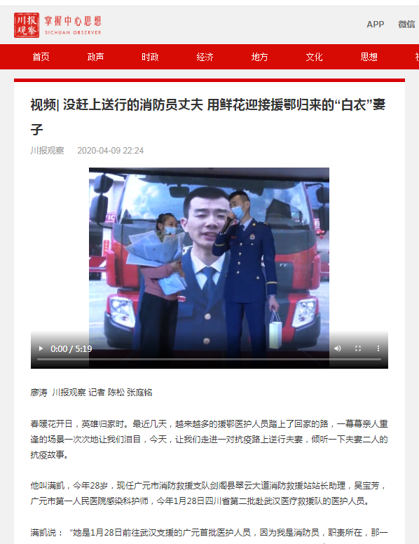 川报观察:视频| 没赶上送行的消防员丈夫 用鲜花迎接援鄂归来的“白衣”妻子