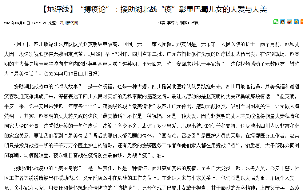 四川新闻网:“搏疫论”:援助湖北战“疫”彰显巴蜀儿女的大爱与大美