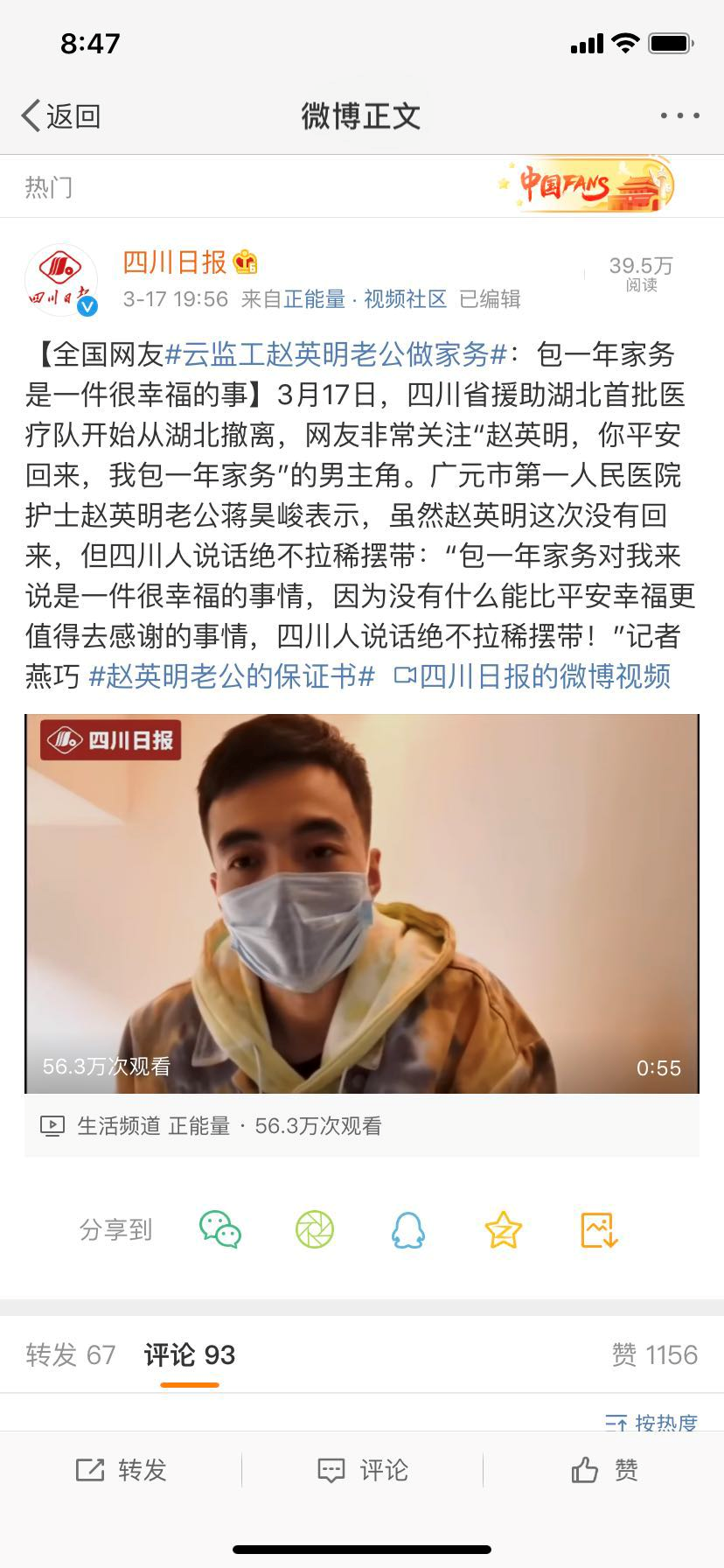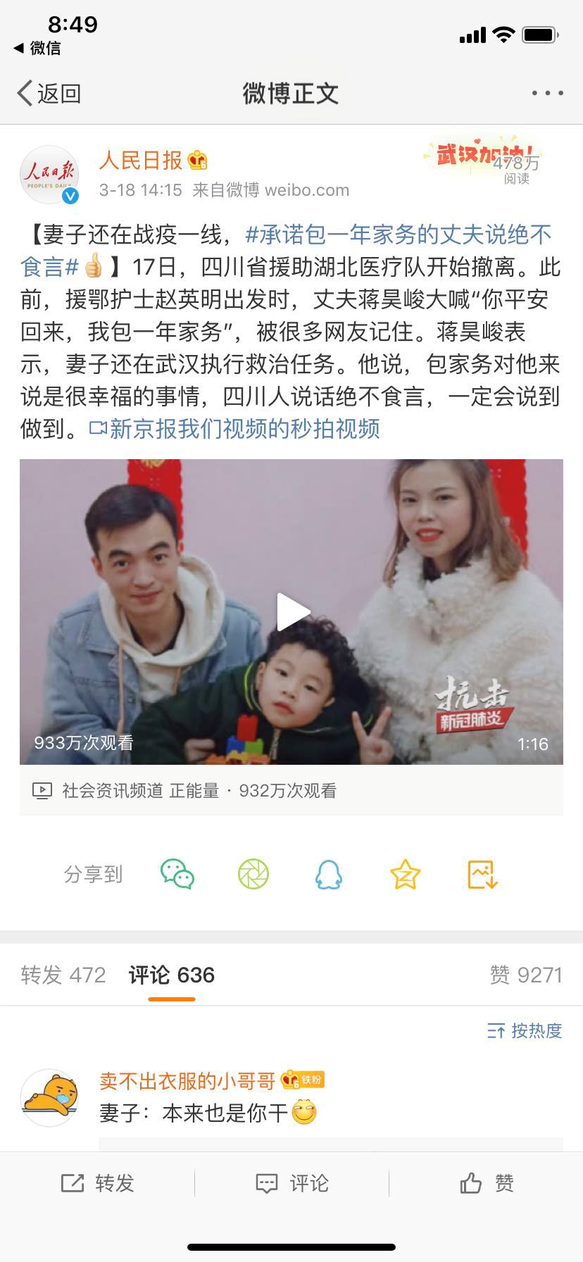 人民日报微博: 妻子还在战疫一线,#承诺包一年家务的丈夫说绝不食言#