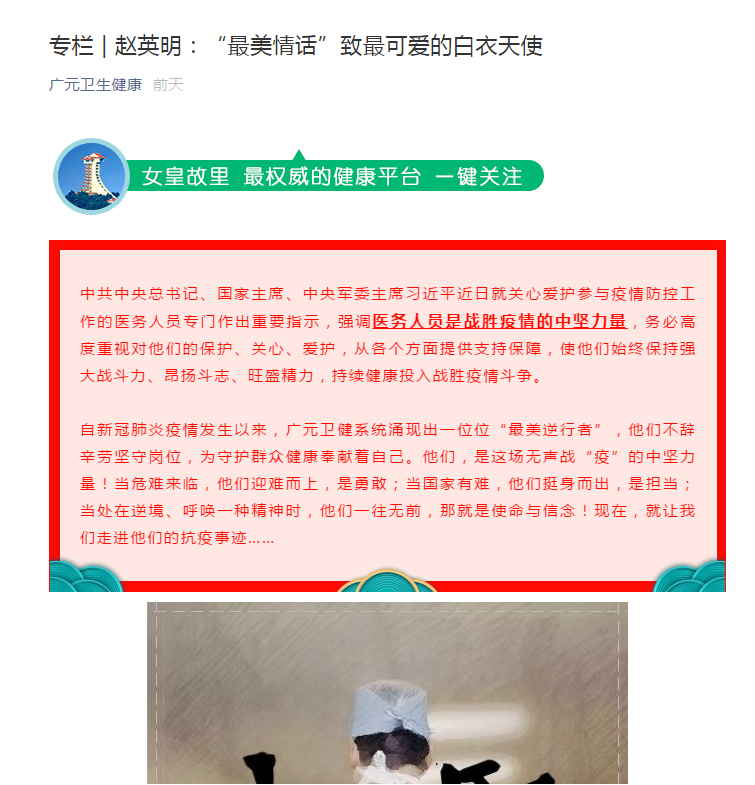 广元卫生健康:专栏 | 赵英明:“最美情话”致最可爱的白衣天使