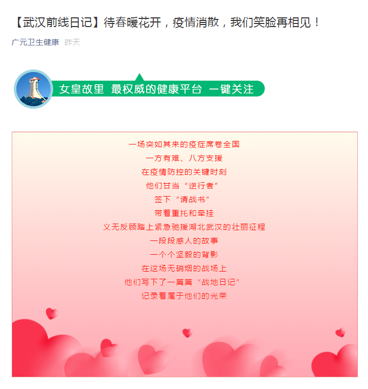 广元卫生健康:【武汉前线日记】待春暖花开,疫情消散,我们笑脸再相见!