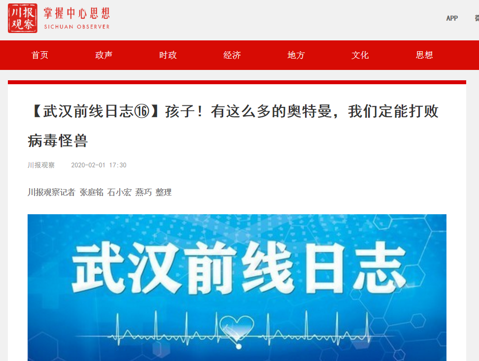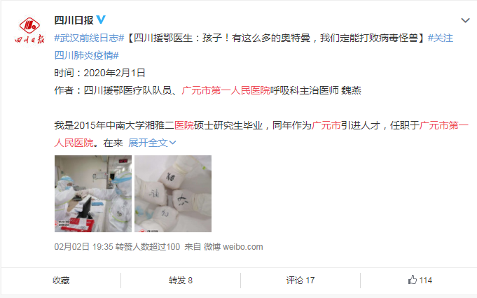四川日报微博:四川援鄂医生:孩子!有这么多的奥特曼,我们定能打败病毒怪兽