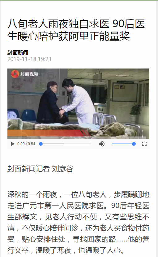 封面新闻:八旬老人雨夜独自求医 90后医生暖心陪护获阿里正能量奖