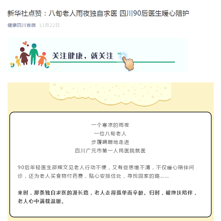健康四川官微:新华社点赞:八旬老人雨夜独自求医 四川90后医生暖心陪护