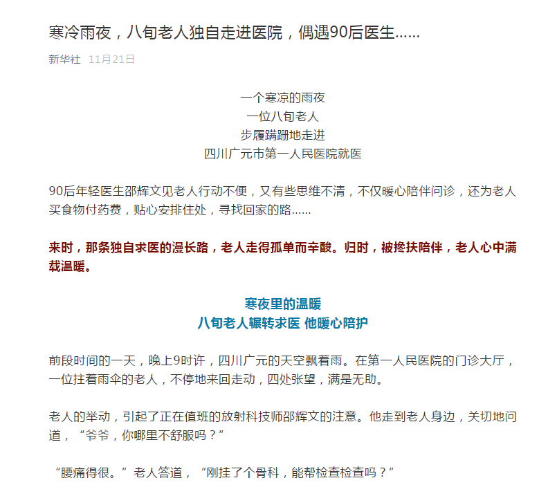 新华社:寒冷雨夜,八旬老人独自走进医院,偶遇90后医生……