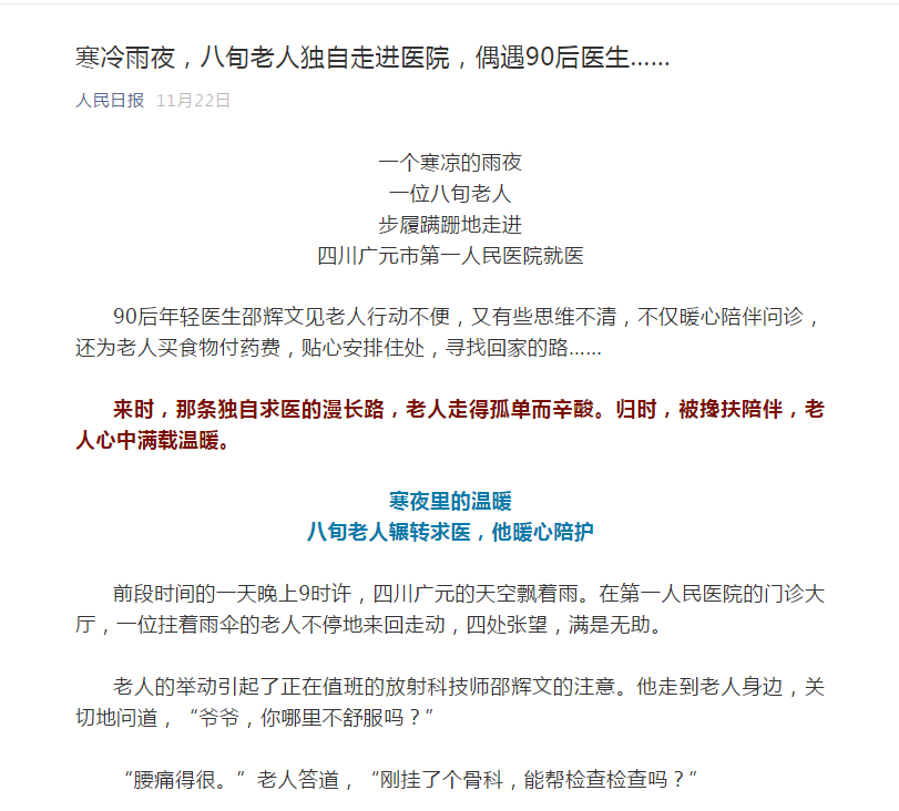 人民日报:寒冷雨夜,八旬老人独自走进医院,偶遇90后医生……