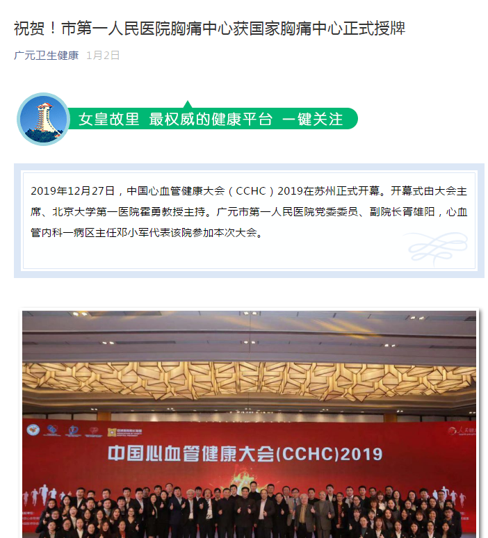 广元卫生健康:祝贺!市第一人民医院胸痛中心获国家胸痛中心正式授牌