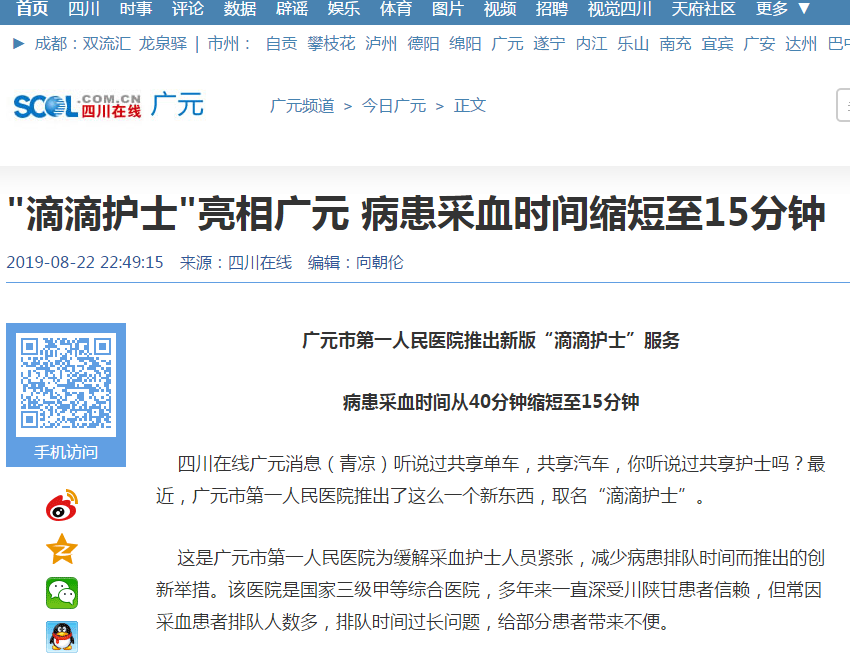 四川在线:"滴滴护士"亮相广元 病患采血时间缩短至15分钟
